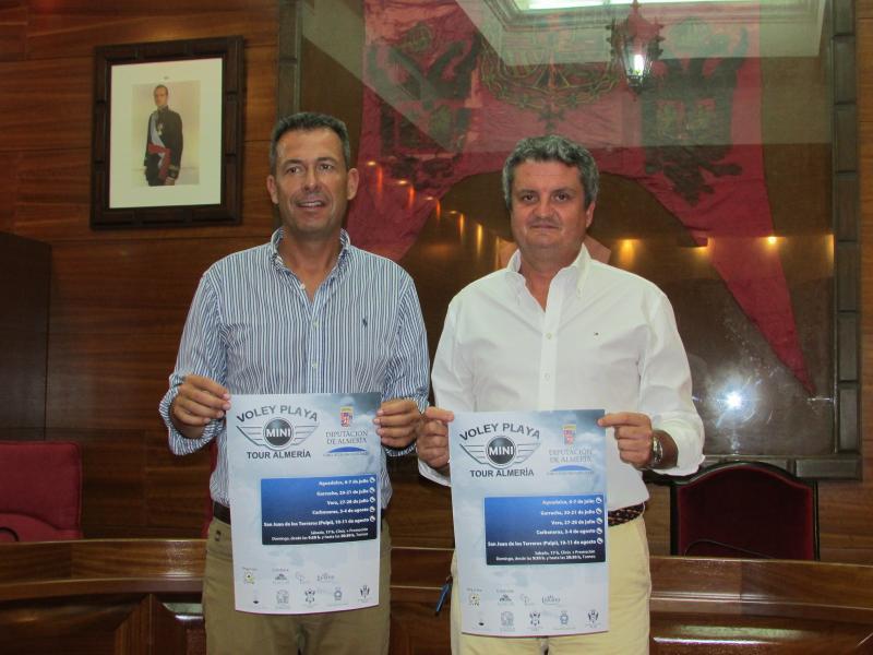 El concejal de Deportes del Ayuntamiento de Vera, Juan de la Cruz Belmonte, junto a Antonio Jesús González, miembro del Club Voley Playa Almería, organizador del evento, presentaba ayer en el Ayuntamiento veratense las actividades previstas para este fin de semana en la localidad, dentro del I Circuito Provincial de Voley Playa Mini Tour Almería.