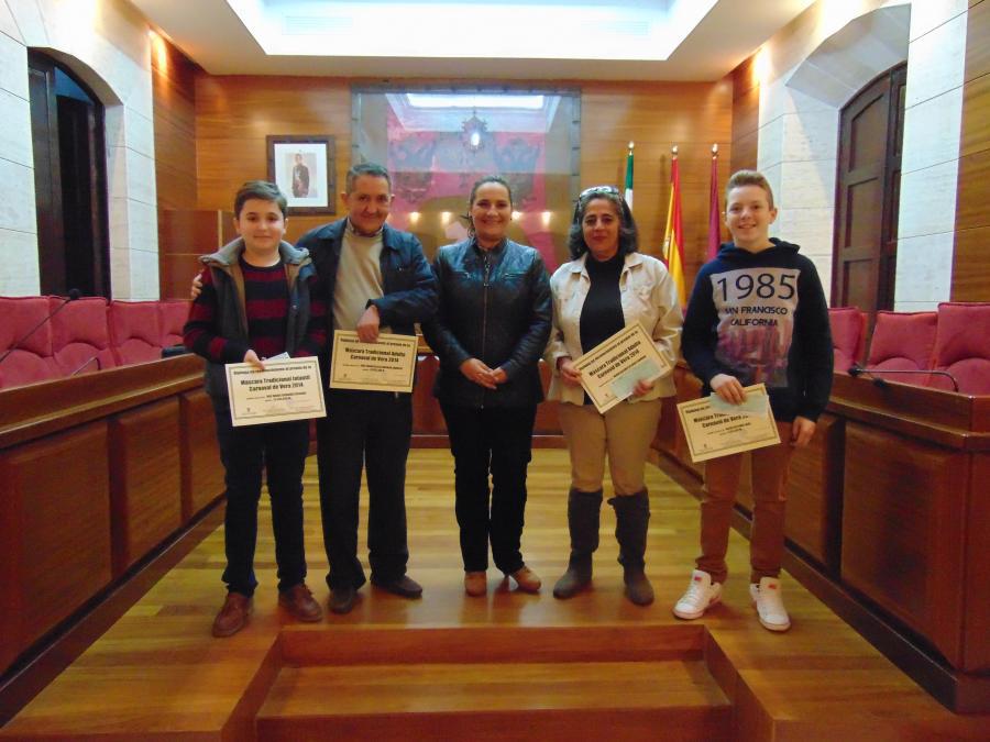 El pasado veintiséis de marzo, en el Salón de Plenos del Ayuntamiento de Vera, con asistencia de la 3er Teniente-Alcalde y Concejala de Festejos, Catalina Soriano Pinar, se hicieron entrega de los DOS PREMIOS que con una cuantía de 100€, a las Mascaras adultas y 2 premios de 50€, a la Mascara tradicional infantil, que la Concejalía de Festejos tenía asignados para, premiar e incentivar, la exhibición de  mascaras carnavalescas, de este año 2014, y demostrar así el talento y la plasticidad en el arte carnavalesco tan arraigado y con tanto esplendor en la ciudad de Vera.