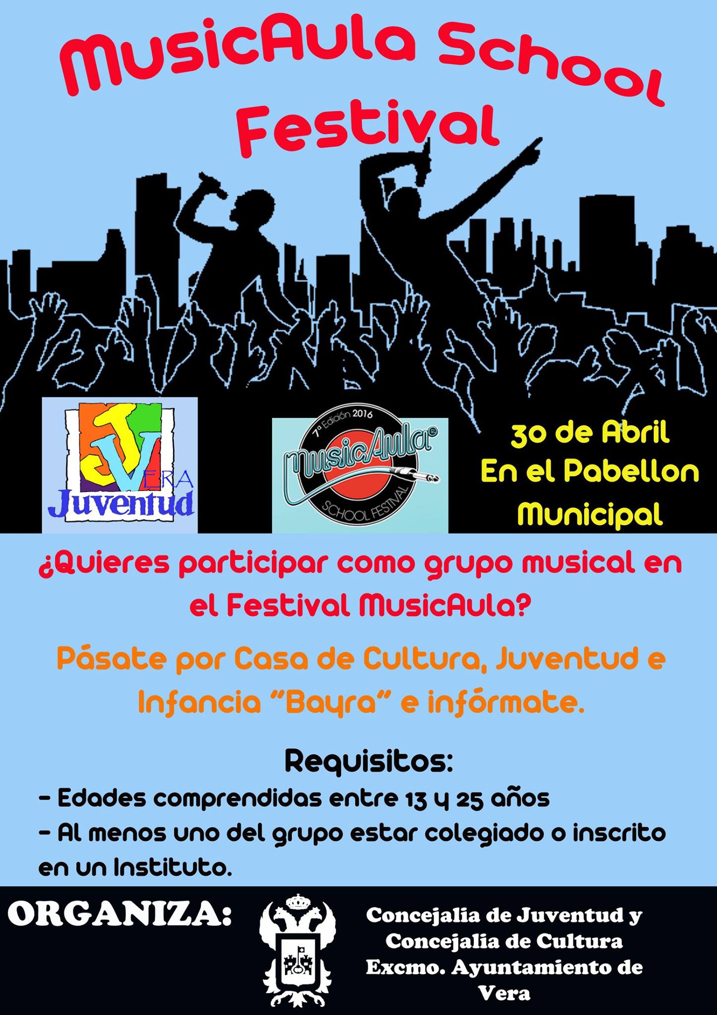 Por su parte, la concejala de Juventud del Ayuntamiento de Vera, Isabel María Belmonte, señalaba que “Vera será la primera sede andaluza de un festival con ámbito nacional. Es, pues, una satisfacción que hayan pensado en Vera para este tipo de festivales. Queremos fomentar el valor de la música en directo y que nuestros jóvenes puedan realizarse y desarrollar sus habilidades”. Ponía de relieve Isabel María Belmonte, que es requisito imprescindible para poder participar en estos eventos que los jóvenes estén inscritos en un centro educativo porque, de este modo, se establece un nexo de unión entre alumnado y profesorado.