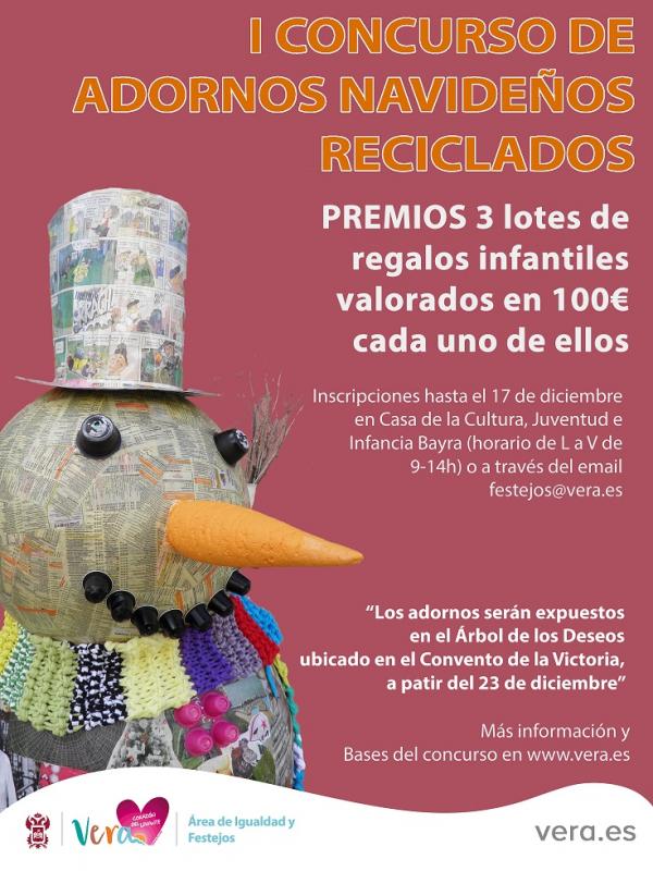 De cara a la celebración de las próximas fiestas navideñas, la concejalía de Festejos del Ayuntamiento de Vera ha organizado el primer concurso de adornos navideños reciclados, “para invitar a los niños y jóvenes del municipio a disfrutar de las fiestas navideñas de forma responsable, participativa y respetuosa con el medio ambiente”, según ha explicado la edil de Festejos, Amparo García, quien ha detallado que “se trata de tomar conciencia sobre la cantidad de residuos diarios que generamos con la consiguiente problemática medioambiental, comprendiendo el valor de evitar consumos innecesarios y promoviendo la búsqueda y descubrimiento de posibles soluciones”.